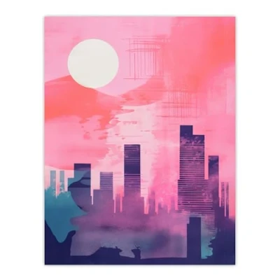 Wee Blue Coo Sunrise City Silhouette Pink Purple Watercolour Painting Extra Large XL Wall Art Poster Print