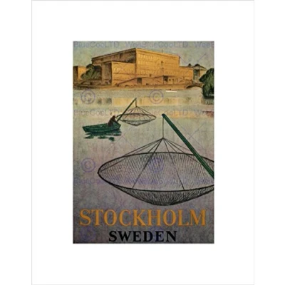 Wee Blue Coo TRAVEL ADVERT STOCKHOLM SWEDEN FISHING RIVER BLACK FRAMED ART PRINT B12X10159