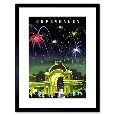 Wee Blue Coo Travel Copenhagen Denmark Tivoli Gardens Fireworks Vintage Framed Wall Art Print