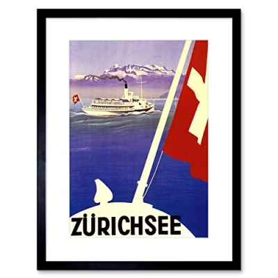 Wee Blue Coo Travel Lake Zurich Switzerland Boat Alpine Mountain Flag Framed Wall Art Print