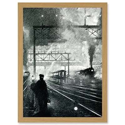 Wee Blue Coo Travel Railway Tracks 1912 Soot Steam Train Locomotive Drawing Moody Artwork Framed Wall Art Print A4