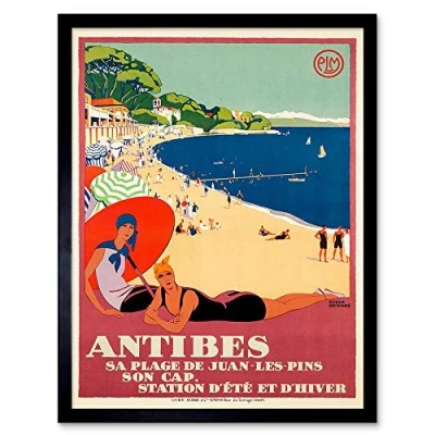 Wee Blue Coo Travel Tourism Antibes Beach Sea Ocean Sun Paris France Art Print Framed Poster Wall Decor 12X16 Inch