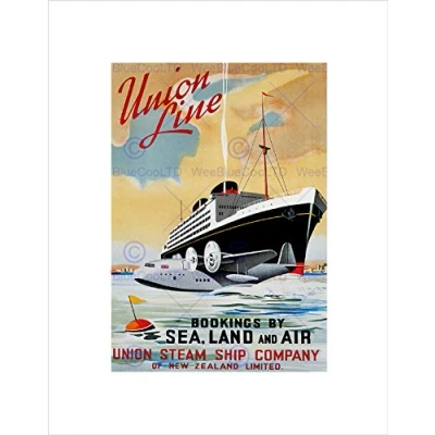 Wee Blue Coo TRAVEL UNION LINE SHIP SAIL SEA PLANE NEW ZEALAND VINTAGE FRAMED PRINT B12X122