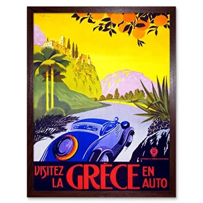 Wee Blue Coo Travel Visit Greece By Car Sun France Vintage Art Print Framed Poster Wall Decor 12X16 Inch