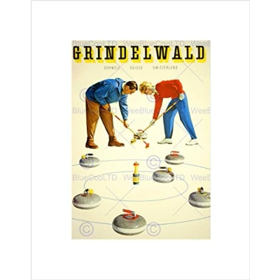Wee Blue Coo TRAVEL WINTER SPORT CURLING GRINDELWALD SWITZERLAND VINTAGE ART PRINT B12X1784