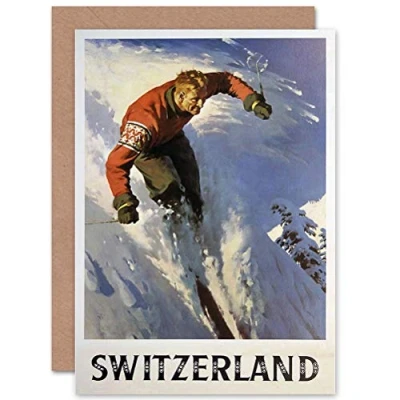 Wee Blue Coo TRAVEL WINTER SPORT SKIING SNOW SKIIER SWITZERLAND GREETINGS CARD