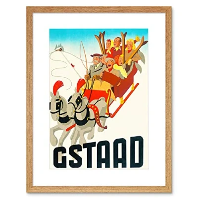 Wee Blue Coo Travel Winter Sport Swiss Alpine Resort Gstaad Sled Horse Snow Framed Wall Art Print