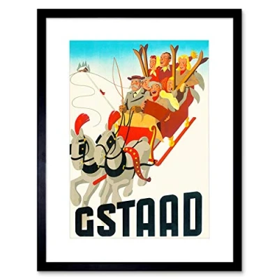 Wee Blue Coo Travel Winter Sport Swiss Alpine Resort Gstaad Sled Horse Snow Framed Wall Art Print