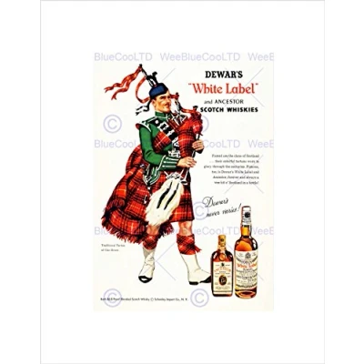Wee Blue Coo Vintage Ad Whisky Alcohol Dewar's White Scotch Tartan Wall Art Print