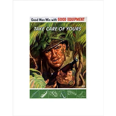 Wee Blue Coo WAR WWII GOOD MEN EQUIPMENT CARE GUN SOLDIER JUNGLE FRAMED ART PRINT B12X10115