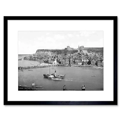 Wee Blue Coo WHITBY FROM WEST CLIFF YORKSHIRE ENGLAND OLD BW FRAMED ART PRINT MOUNT B12X1371