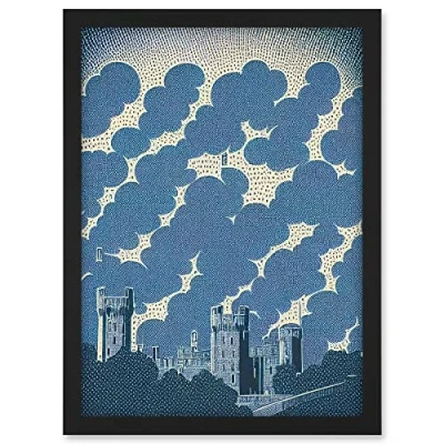 Wee Blue Coo Windsor Castle with Cloudy Sky Lithograph Illustration in Artwork Framed A3 Wall Art Print
