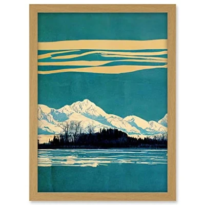 Wee Blue Coo Winter Lakeside Landscape With Snowy Mountains Duotone Teal Artwork Framed A3 Wall Art Print