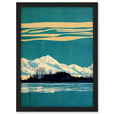 Wee Blue Coo Winter Lakeside Landscape With Snowy Mountains Duotone Teal Artwork Framed A3 Wall Art Print