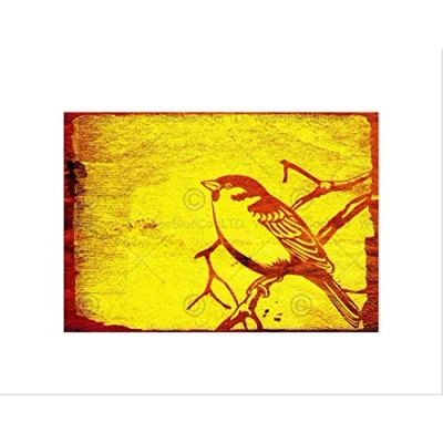 Wee Blue Coo Woodcut Bird Branch Red Yellow Illustration Black Framed Art Print B12X9620
