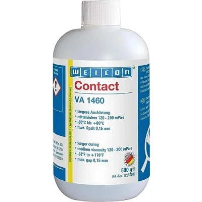 CHARACTERISTICS - WEICON Contact VA 1460 is suitable for bonding a wide variety of materials, both to and among each other. DETAILS - The cyanoacrylate adhesive for special requirements is very economical, medium viscosity, low odour, little efflorescence and cures for a very long time. APPLICATION - WEICON Contact VA 1460 can be used in numerous industrial sectors. When cured, the adhesive is less susceptible to moisture influences. QUALITY - 100% German Quality - The product meets the highest quality requirements in compliance with physical, safety, toxicological and ecological regulations. PROCESSING - Clean & degrease surfaces with WEICON Surface Cleaner. Apply the adhesive only to one of the surfaces to be bonded with a layer thickness of min. 0.05mm & max. 0.2mm., Weight: 1.2015193279 Pounds, Manufacturer: WEICON