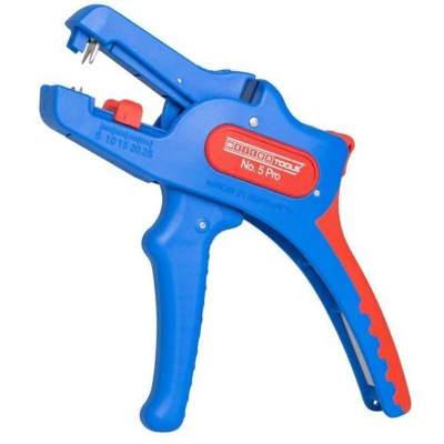 General description The Weicon® Pro No.5 Wire Stripper is designed for quick and precise stripping of common stranded and solid conductors ranging from 0.2 to 16 mm² (24-5 AWG). It features an automatic adjustment mechanism that adapts to the conductor size, eliminating the need for manual settings. The tool is equipped with an integrated side cutter suitable for copper and aluminum conductors up to 3 mm in diameter, making it versatile for various applications. Technical specifications Suitable for conductors from 0.2 to 16 mm² (24-5 AWG) Automatic adjustment for conductor size Integrated side cutter for copper and aluminum up to 3 mm diameter Adjustable length stop from 5 to 25 mm Ergonomic, anti-slip handle Locking mechanism for storage Made with high-quality steel blades from Solingen Compatibility and accessories Compatible with common flexible and solid conductors Includes replaceable blades Installation No installation required; ready to use out of the box Usage Insert the