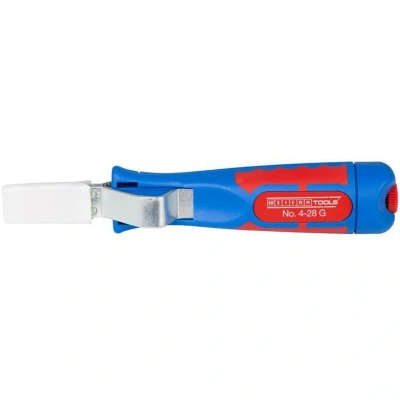 General description The Weicon No. 4-28 H Cable Stripper is designed for precise, fast, and safe stripping of all common round cables with diameters between 4 and 28 millimeters. It features an ergonomic, non-slip handle for comfortable use and a self-rotating, integrated cutting blade that automatically adjusts from circular to longitudinal cutting. The blade's cutting depth can be infinitely adjusted using a set screw, preventing damage to inner conductors. Additionally, it includes a hooked blade that can be covered with a safety cap to reduce injury risk. Made entirely in Germany, this tool offers high safety standards and durability. Technical specifications Application area: cables with outer diameter 4-28mm Length: 185mm Weight: 96g Material: glass fibre reinforced polyamide Blade: high-quality steel from Solingen, replaceable and adjustable Compatibility and accessories Suitable for flexible and solid conductors with PVC insulation Includes a hooked blade for additional