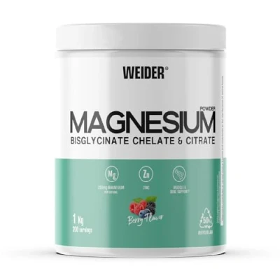 Weider Magnesium Powder (1kg) Berry Flavour, 250mg /Serving Bisglycinate and Citrate in with Zinc, Muscle Bone Support, Helps Reduce Fatigue, No Added Sugar, Vegan