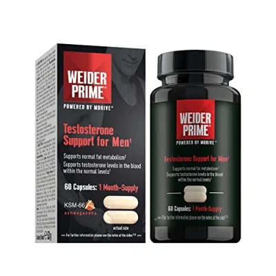 Weider Prime Testosterone Support for Men, Ashwagandha Extract (KSM 66) Supports Energy, Lean Muscle, Mental Focus, Vitality, 60 Capsules
