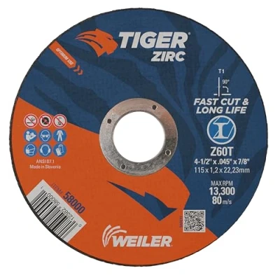 Weiler 58000 4 1/2" x 0.045" Tiger Zirc Type 1 Thin Cutting Wheel, Z60T, 7/8" A.H. (Pack of 25)