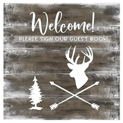 Welcome: Rustic Wood Guestbook For Vacation House, Guesthouse Lodge Visitors, Rental Cabin B&B Holiday Hotel Blank Unlined Sign In Square Pages To Write In, Deer Lettering Guest Home Book