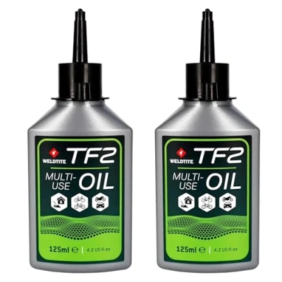 HIGH PERFORMANCE: Keep your bicycle running smoothly with this water-resistant all-purpose cycle oil by WELDTITE TF2 DURABLE FORMULA: Resists water, ensuring long-lasting protection and performance in all conditions VERSATILE USE: Excellent performance for not just your biking needs but is great for maintaining & reducing degradation of garden tools, equipment or parts in your home that need lubrication EASY APPLICATION: Applies easily to chains, gears, and other moving parts to keep them well-lubricated for a smoother ride IDEAL SIZE: Convenient pack of two 125 ml bottles offers enough oil to not only maintain your bike's performance but your garden tools, hinges and other equipment or parts as well