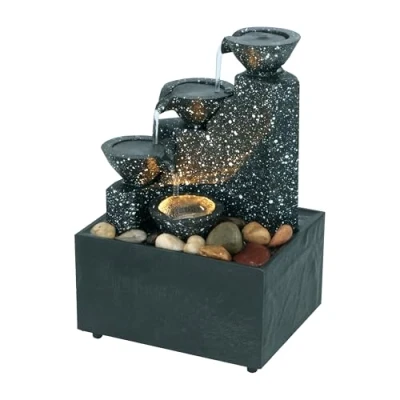 AmazonBattery Powered Detailed ABS & Resin Triple Tiered LED Light Up Four Bowl Cascading Indoor Water Fountain Add a Little Slice of Serentiy into Your Home or Workspace Complete with Decorative Rocks for Zen-sation! Quiet Water Pump Constantly Recycles Water from Sub-Structure Reservoir so No Need to Keep Topping Up Makes an Ideal Gift for those Looking for a Small Water Feature or As a Focal Point for Enhancing Your Calm Measures Around 17 cm by 11 cm x 9 cm | Requires 2 x AA Batteries (Not Included) | N.B. Item is NOT A TOY