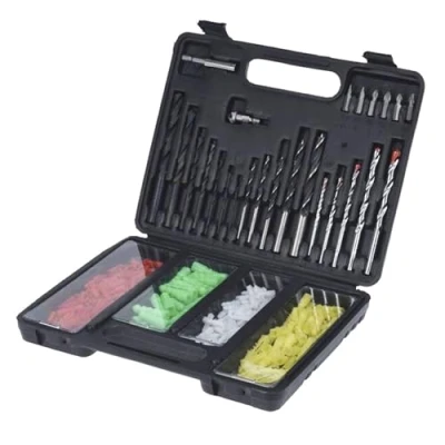This set includes 300 pieces essential for various drilling and fixing tasks. Comes in a practical black polypropylene case, which makes it easy to carry. Contains drill bits for wood, stone and metal, as well as dowels in various colours. Ideal for professionals and DIYers. Its organized design ensures that you always find the piece you need.