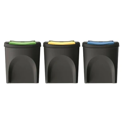Wheelie bin or recycling line for the most convenient waste separation in the household. This range of recycling containers has as main features their lid on the top and their special embossing on the top, thanks to which they can be easily stacked inside each other, stable inside each other. The modular capacity of these waste paper bins makes them perfect for places with limited space. And coloured stickers can be glued to the lids that indicate the sorted waste types. The closure of each bin is easy to remove and is equally suitable for attaching the bin bags. - Dimensions: approx. Each bucket: 15.5 x 11.5 x 18 inches (L x W x H). Capacity: 3 buckets x 25 litres.