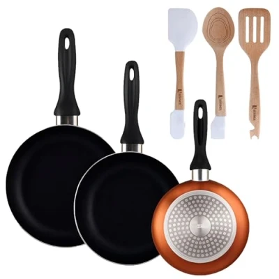 Made of pressed aluminium with an elegant metallic bronze exterior, they offer great thermal resistance and optimal performance in everyday use. The black non-stick interior allows you to cook without food sticking and makes it easy to clean up after each preparation. Set consisting of 16 x 3.5 cm, 20 x 4.5 cm and 24 x 4.5 cm frying pans that cover all culinary needs. Ergonomic, stay cool handles and bottoms suitable for all hob types, including induction. Spoon and spoon made of silicone and beech wood, durable, BPA free and comfortable to use., Weight: 7.17384200548 pounds, Manufacturer: Wellhome