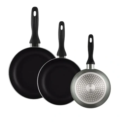 Set of 3 pans 16/20/24 pressed aluminium Frying pans made of pressed aluminium with exterior coated in an elegant metallic grey colour, resistant to high temperatures, and non-stick interior in black. Pressed aluminum has high capacities to capture and distribute heat efficiently, resulting in energy savings. It has handles that remain always cool, to ensure safety while cooking, ergonomically shaped, comfortable and manageable. Base suitable for all types of cookers, including induction. Dimensions: 16 x 3.5 / 20 x 4.5 / 24 x 4.5 cm.