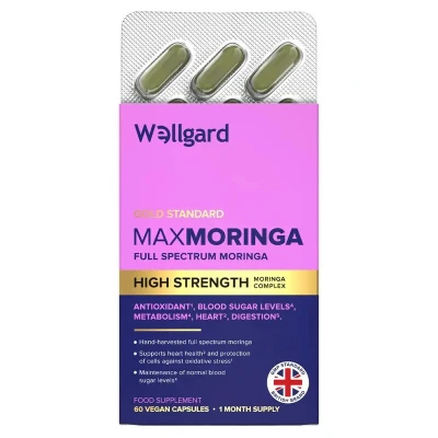 UNLOCK THE POWER OF FULL-SPECTRUM MORINGA – Unlock the power of one of nature’s most nutrient-dense plants. Wellgard Max Moringa combines hand-harvested moringa, ginger root extract, and essential vitamins to support heart health, metabolism, digestion, and balanced blood sugar - all in one simple daily supplement. BALANCED BLOOD SUGAR, STEADY ENERGY – Say goodbye to energy crashes. Max Moringa’s carefully selected nutrients help maintain normal blood sugar levels, promoting stable energy throughout the day. No spikes, no slumps - just consistent, natural vitality. BOOST METABOLISM & OVERALL WELLNESS – Feel great, stay energised, and fuel your body efficiently. Vitamin B1 (Thiamine) supports energy metabolism, helping convert food into fuel while also contributing to heart health and nervous system function. SUPPORTS HEART HEALTH – A healthy heart is the foundation of overall wellness. Max Moringa contains Thiamine (Vitamin B1), an essential nutrient that contributes to normal heart function, keeping your cardiovascular system in top condition. DIGESTION & GUT SUPPORT WITH GINGER – Good health starts in the gut. Ginger Root Extract is a natural digestive aid that supports normal stomach function, enhances digestion, and helps your body absorb nutrients more effectively. EASY TO TAKE, EASY TO FEEL THE DIFFERENCE – Just two capsules a day provide the essential nutrients your body needs to support blood sugar balance, metabolism, heart health, and digestion - in one powerful, plant-based formula.