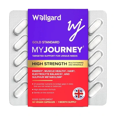 THE MULTIVITAMIN FOR YOUR UNIQUE JOURNEY: Wellgard My Journey isn’t your everyday multivitamin - it’s formulated for those on unique journeys. With 21 essential nutrients, it helps bridge the gaps when diets lack variety or balance, giving your body the nutrient it needs to thrive. ENERGY & VITALITY THAT LASTS: Tired of feeling drained? Wellgard My Journey’s powerful dose of Vitamin B₁₂ (20,000% NRV) supports the reduction of tiredness and fatigue, fuelling you with the natural, steady energy to approach each day with confidence. BALANCE FROM WITHIN FOR AN ACTIVE LIFE: When your journey demands more, Wellgard My Journey helps balance your body's unique needs. Formulated with magnesium malate, it supports your electrolyte balance and muscle function, so you’re always ready for what’s next. IMMUNE & BONE SUPPORT YOU CAN TRUST: Vital nutrients like Vitamin D3 don’t just support immunity - they’re essential for healthy bones, too. Wellgard My Journey is designed to help you stay resilient, and ready. GENTLE IRON ABSORPTION: Iron can be tough on the stomach, but Wellgard My Journey uses ferrous fumarate, a gentle form of iron, and it pairs it with Vitamins A, B2, C, and copper for optimal absorption. NOURISH YOUR HAIR FROM WITHIN: Wellgard My Journey combines biotin, zinc glycinate, and other key nutrients that support healthy hair, helping you stay nourished inside and out.