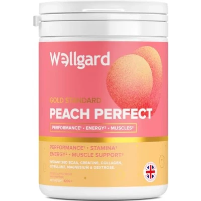JoybuyWellgard Peach Perfect Powder is a daily supplement blend with a refreshing pink lemonade and peach flavor, featuring 5g creatine, 5g collagen, BCAAs, L-citrulline, and magnesium glycinate, naturally sweetened with Stevia and free from artificial additives—ideal for morning or pre-workout use.