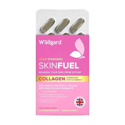 Wellgard Skin Fuel Deep Skin Nutrition is a vegan supplement with hyaluronic acid, bamboo silica, Superoxide Dismutase, chlorella, Vitamin C, Zinc, and Vitamin A, supporting collagen production, skin health, and protection against oxidative stress from within. Not suitable for those allergic to listed ingredients.