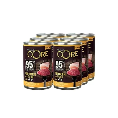 GRAIN-FREE GOODNESS: Our Wellness CORE 95 percent Chicken and Duck is grain-free to support your dog’s sensitive stomach. TASTY PÂTÉ: Our dog wet food is crafted with 95 percent of animal protein ingredients from a single protein source. COMPLETE AND BALANCED: Our Wellness CORE 95 percent Chicken and Duck wet food is enriched with vitamins and minerals, ensuring that your dog has the best start in life! LIMITED INGREDIENTS: Our recipe for our wet dog food is a delicious recipe that provides a natural, complete and balanced meal made from 95 percent chicken combined with tasty veggie pieces. NATURALLY HYPOALLERGEN: This product does not contain grains, wheat, gluten, corn, soy, dairy, eggs, artificial colours, flavours or preservatives. PACKAGING: This package includes 6 tins of 400 g Wellness CORE 95 percent Chicken and Duck.