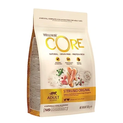 SUPPORTS IDEAL WEIGHT: Our CORE Sterilised Original helps with the support of an ideal weight of sterilised, overweight, and less active cats in a healthy way. HAIRBALL CONTROL: Our CORE Sterilised Original will be helpful with controlling the hairball amount of your cat thanks to the support of optimal fibre content. HEALTHY HEART: Our dry cat food for sterilised cats contains supplemental taurine to support a healthy heart. To keep your furry friend happy and healthy! HEALTHY DIGESTIVE SYSTEM: Our Wellness CORE cat food is easy to digest and contains prebiotic fibre and probiotics, providing your furry friend with a healthy digestive system! LOW CARBS AND NO FILLERS: Our recipes are grain-free and sugar-free, supporting a high-protein and a meat-rich nutrition for your cat. STRONG IMMUNE SYSTEM: The dry cat food contains all the vitamins, minerals, and high-quality antioxidants that your cat needs, creating a strong immune system!