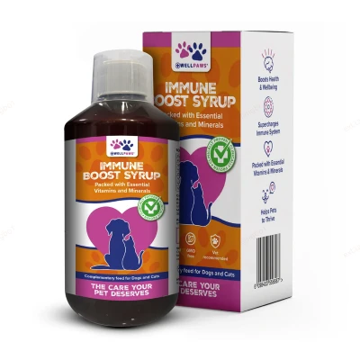 Wellpaws Immune Boost Syrup for Dogs&Cats 300ml is a daily supplement formulated with salmon oil, hydrolysed salmon protein, and Fibruline Instant to support immune and digestive health. Suitable for all life stages, it can be added to food, water, or given directly for easy nutrition.