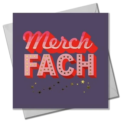 DIMENSIONS: 150x150mm CAPTION: Merch Fach ENGLISH TRANSLATION: Little Girl EMBELLISHMENT: Foil detail with Shiny Gold BLANK INSIDE: Space inside for your own message MADE IN THE UK: Designed, printed and finished in the UK HIGH-QUALITY: Printed on top quality heavy 350gsm card stock, with envelope included SUSTAINABLE: Comes wrapped in Compostable bag or with a card catch label. Both the greetings card & envelope are sustainably sourced and recyclable STANDARD LETTER SIZE: Can be sent with Royal Mail standard letter stamps
