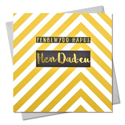 DIMENSIONS: 150x150mm CAPTION: Penblwydd Hapus Hen Dad-cu ENGLISH TRANSLATION: Happy Birthday Great Grandad EMBELLISHMENT: Foil detail with Shiny Gold BLANK INSIDE: Space inside for your own message MADE IN THE UK: Designed, printed and finished in the UK HIGH-QUALITY: Printed on top quality heavy 350gsm card stock, with envelope included SUSTAINABLE: Comes wrapped in Compostable bag or with a card catch label. Both the greetings card & envelope are sustainably sourced and recyclable STANDARD LETTER SIZE: Can be sent with Royal Mail standard letter stamps