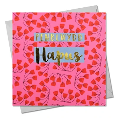 DIMENSIONS: 150x150mm CAPTION: Penblwydd Hapus ENGLISH TRANSLATION: Happy Birthday EMBELLISHMENT: Foil detail with Shiny Gold BLANK INSIDE: Space inside for your own message MADE IN THE UK: Designed, printed and finished in the UK HIGH-QUALITY: Printed on top quality heavy 350gsm card stock, with envelope included SUSTAINABLE: Comes wrapped in Compostable bag or with a card catch label. Both the greetings card & envelope are sustainably sourced and recyclable STANDARD LETTER SIZE: Can be sent with Royal Mail standard letter stamps