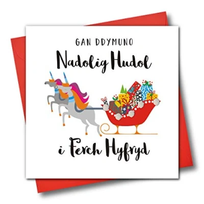 Welsh Language Embellished Christmas Greeting Card, GAN Ddymuno Nadolig Hudol I Ferch Hyfryd, Wishing A Lovely Daughter Magical Christmas, Unicorn Sleigh