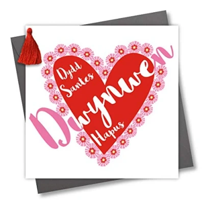 DIMENSIONS: 150x150mm CAPTION: Dydd Santes Dwynwen Hapus ENGLISH TRANSLATION: Be my Valentine? EMBELLISHMENT: Red Tassel BLANK INSIDE: Space inside for your own message MADE IN THE UK: Designed, printed and finished in the UK HIGH-QUALITY: Printed on top quality heavy 350gsm card stock, with envelope included SUSTAINABLE: Comes wrapped in Compostable bag or with a card catch label. Both the greetings card & envelope are sustainably sourced and recyclable STANDARD LETTER SIZE: Can be sent with Royal Mail standard letter stamps