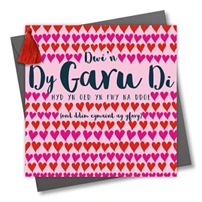 DIMENSIONS: 150x150mm CAPTION: Dwi'n dy garu di, hyd yn oed yn fwr na ddoe (and ddim cymaint ag yfory) ENGLISH TRANSLATION: I Love You Even More than Yesterday (but not as much as tomorrow) EMBELLISHMENT: Red Tassel BLANK INSIDE: Space inside for your own message MADE IN THE UK: Designed, printed and finished in the UK HIGH-QUALITY: Printed on top quality heavy 350gsm card stock, with envelope included SUSTAINABLE: Comes wrapped in Compostable bag or with a card catch label. Both the greetings card & envelope are sustainably sourced and recyclable STANDARD LETTER SIZE: Can be sent with Royal Mail standard letter stamps