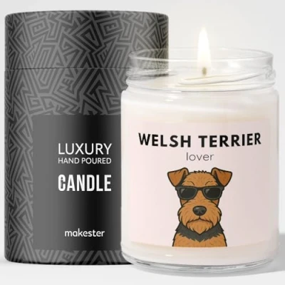 Welsh Terrier Gifts Luxury Soy Wax Candle Vanilla, Jasmine, Sugared Almond Dogs in Shades Makester