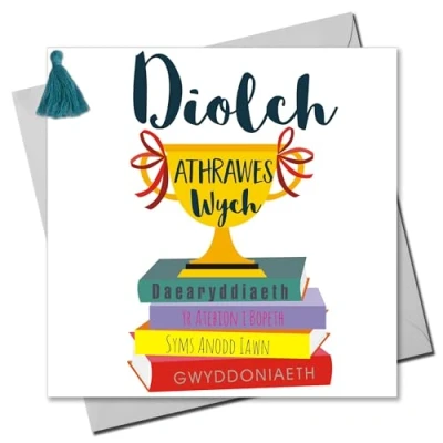 Welsh Thank You Teacher Card, Trophy, Tassel Embellished