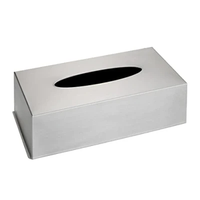 Protective and decorative cover for conventional, rectangular cosmetic tissue boxes Made of rustproof, brushed stainless steel Dimensions (W x H x D): 25 x 8 x 12 cm