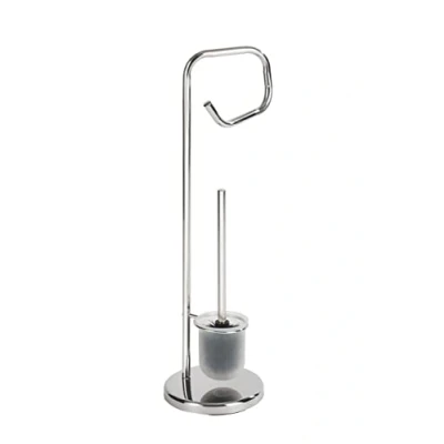 Combination of toilet roll holder with open WC brush holder Incl. WC brush with a replaceable white brush head with a diameter of 8.5 cm and a white plastic handle Made of white chrome Dimensions (W x H x D): 21 x 66 x 19 cm Solid round stand