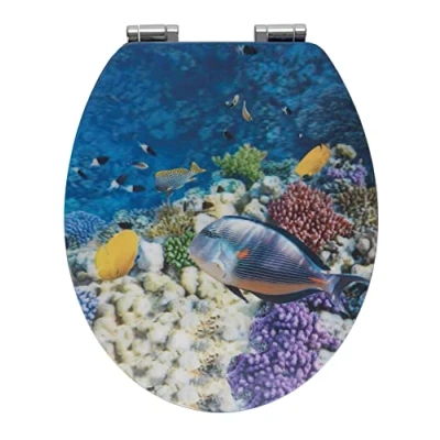 WENKO 22975100 Toilet seat Fish 3D with soft closing mechanism, rustproof Fix Clip hygienic zinc pressure cast mounting element, MDF, 38 x 44.5 cm, Multicoloured